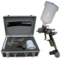 Pistola gravedad L.V.M.P. alta calidad de acabado para aplicación de esmaltes,lacas,barnices,etc. Equipada con difusor de 6 salidas, tarro de nylon 3/4, reguladores de gran precisión. Dispone de 3 boquillas diferentes de 1,3, 1,6 y 2,0 mm.